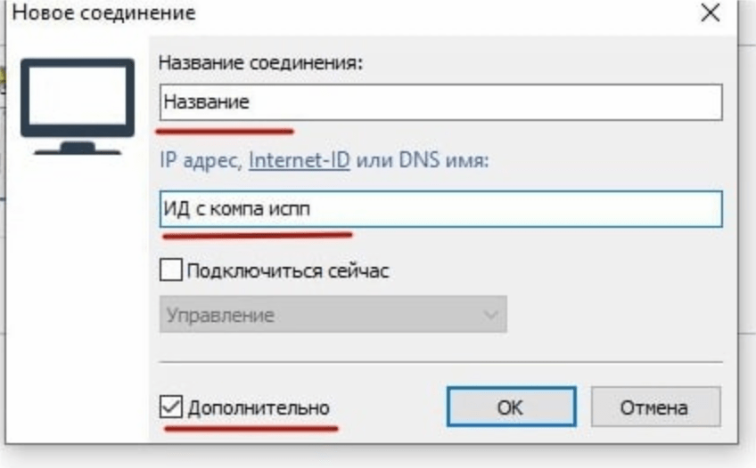 - Укажите «Название соединения», «Internet-ID» и установите галку в поле «Дополнительно»
