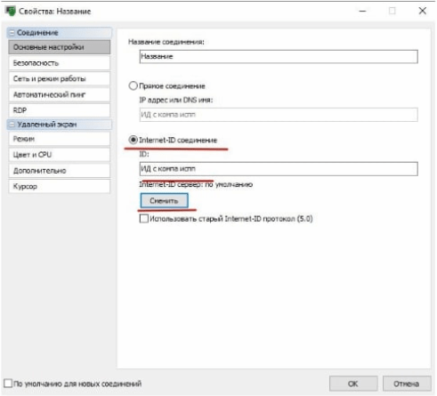 - В открывшемся окне выберите «Internet-ID соединение», еще раз укажите ID компьютера, к которому хотите подключиться и нажмите кнопку «Сменить».