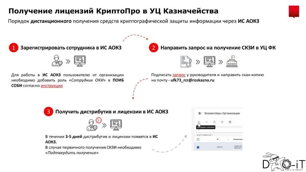 Подписать запрос (шаблон запроса — 2_Заявка_на_получение_средств_криптографической_защиты_информации) у руководителя и направить скан-копию на почту — ufk73_rcr@roskazna.ru - Получить дистрибутив и лицензии в ИС АОКЗ