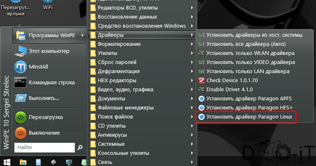 - Далее устанавливаем драйвер Paragon Linux из меню «Пуск à Программы WinPE à Драйверы à Установить драйвер Paragon Linux»