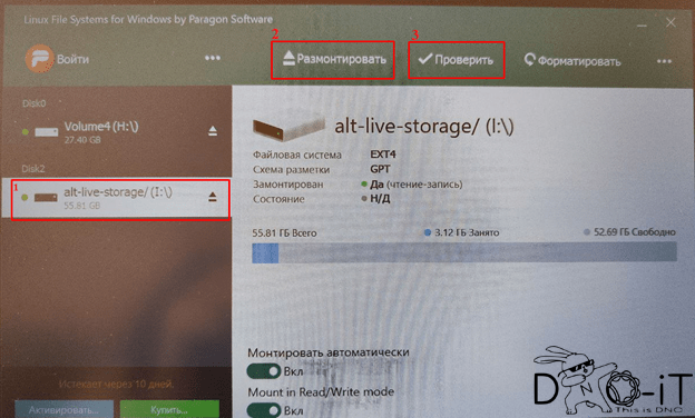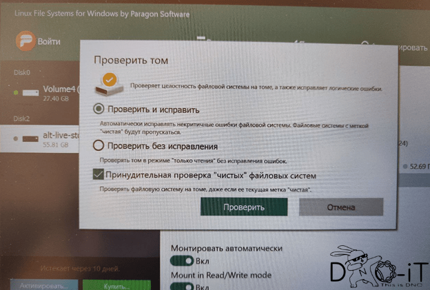 - Далее запуститься софтинка для работы с линуксовой ФС, где необходимо выбрать флэшку с системой «Альтобразование», размонтировать (если смонтирована) и нажать кнопку «проверить»: