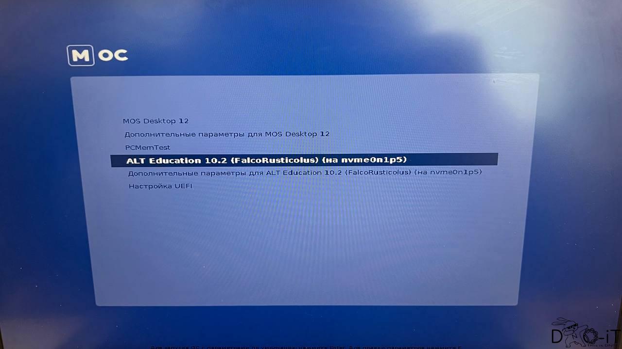 Перезагружаемся, и во время отсчета 3..2..1… нажимаем ESC — видим меню загрузки где и появляется Alt Education 10.2