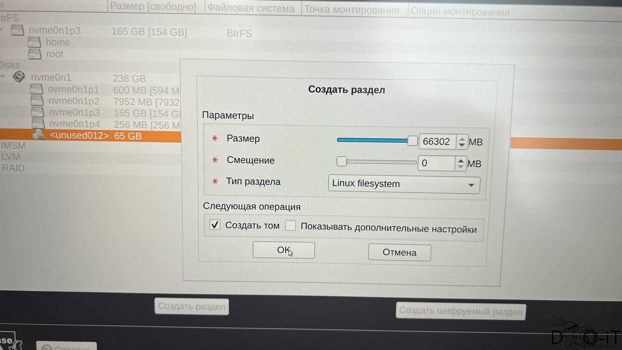 - Указываем его размер за вычетом освобождаемого пространства (в данном примере я выделил 65Гб, но можно и 30 выделить, все равно дальше в ручном режиме устанавливать Alt)