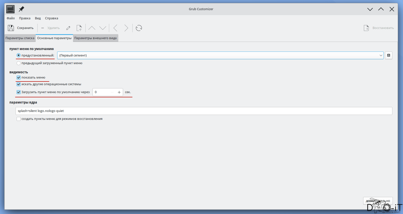Запускаем из меню «grub-customizer», переходим во вкладку «Основные параметры» и настраиваем: