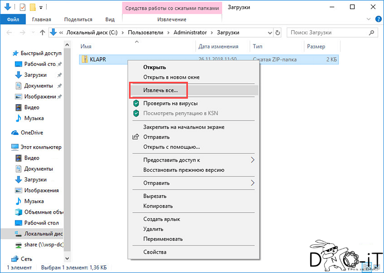 - Нажмите правой кнопкой мыши на архив и выберите Извлечь все.