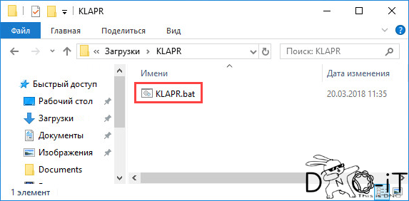 - Перейдите в папку с файлами из архива и запустите файл KLAPR.bat.