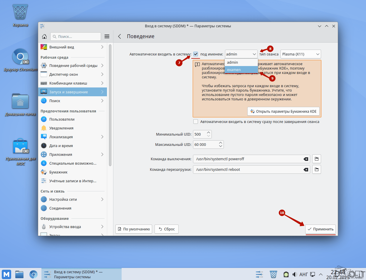Для включения автоматического входа в пользователя системы чМОС12 выполните следующие шаги: