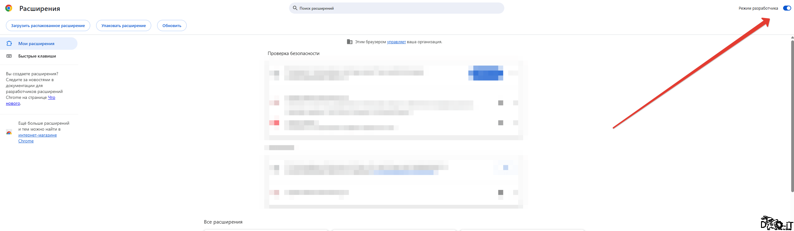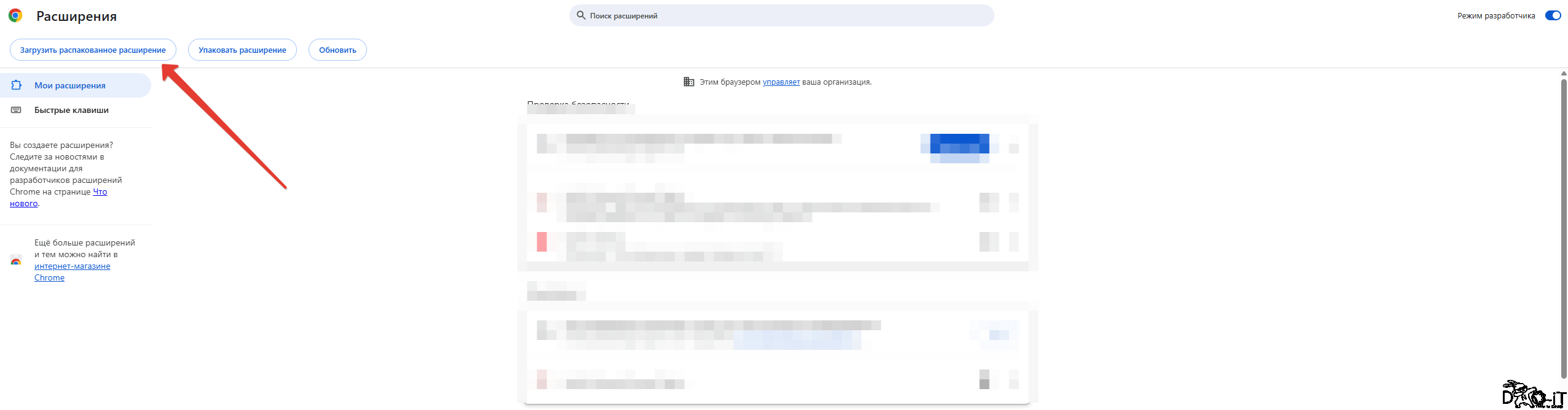 - Нажимаем на кнопку Загрузить распакованное расширение и выбираем папку с расширением